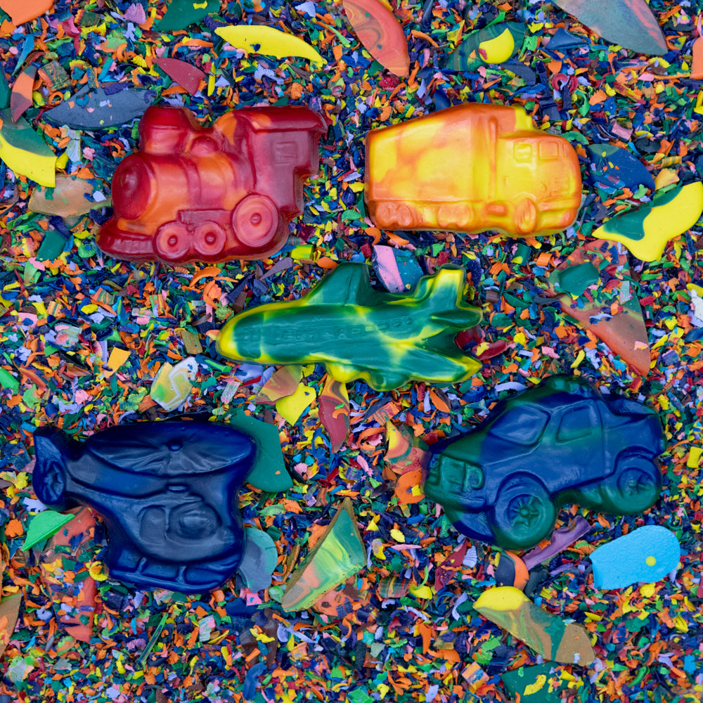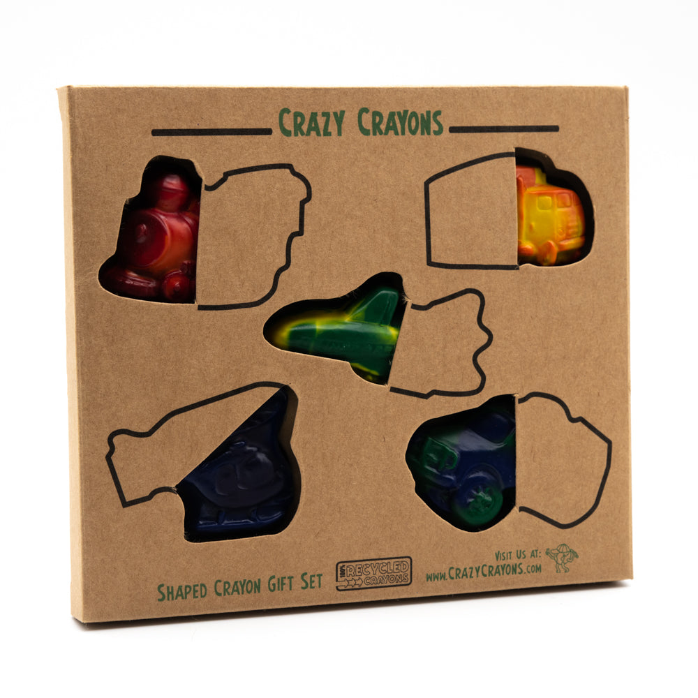 Transportation shaped colored crayons packaged in a plastic-free Kraft box, 5" x 6.5".